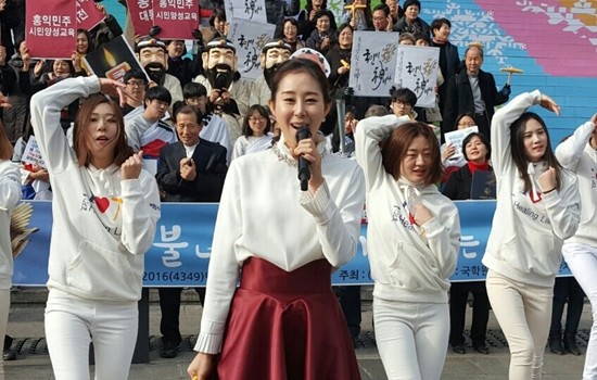 김유나는 지난 21일 세종로 정부청사대로에서 거행된 ‘촛불이후 우리가 꿈꾸는 세상’ 행사에 참석, 신곡 ‘일어나’를 열창했다.