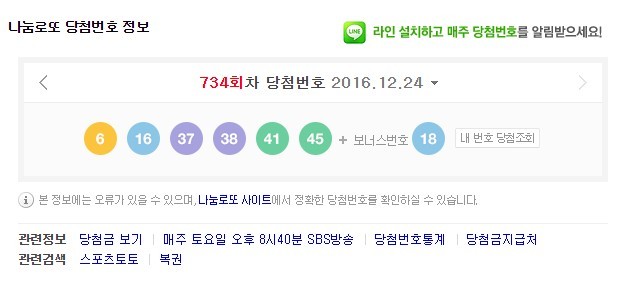한편 로또 734회는 ‘6, 16, 37, 38, 41, 45’에 2등 보너스번호 ‘18’으로 발표됐다.