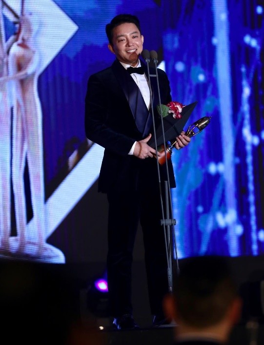 그는 인기상을 수상한 후 트로피를 들고 수상 소감을 밝히고 있었다.