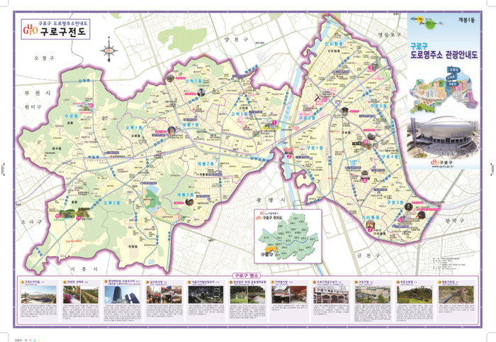 전면은 고척스카이돔, 서울디지털산업단지, 남구로시장, 안양천 산책로, 궁동생태공원, 항동기찻길 등 특색 있는 명소에 대한 위치 및 소개와 함께 구 전체를 한눈에 볼 수 있도록 지도형식으로 만들었다.