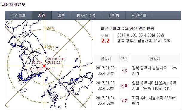 6일 오전 5시 31분께 경북 경주시 남남서쪽 11㎞ 지역에서 규모 3.3의 지진이 발생한지 2분 후 규무 2.2의 지진이 다시 발생하며 시민들을 불안감에 떨게 만들었다.