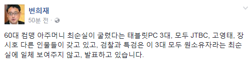 11일 변희재 전 대표의 페이스북에는 ‘60대 컴맹 아주머니 최순실’이라는 시작된 글이 게재됐다.