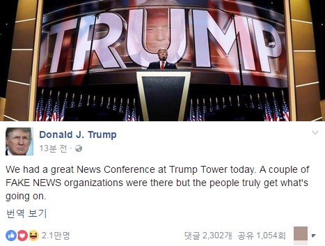 트럼프 당선인은 11일(현지시간) 대선 승리 후 처음 가진 기자회견을 마치고 자신의 페이스북에 "우리는 오늘 트럼프 타워에서 훌륭한 기자회견을 가졌다"며 "몇 개의 가짜 뉴스 조직이 있었지만, 사람들은 실제로 무슨 일이 벌어지고 있는지 알아낸다"고 글을 게재했다.