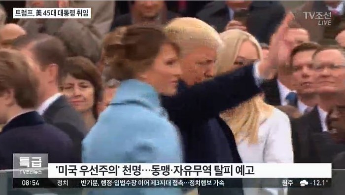 빨간 넥타이를 맨 트럼프가 선서를 끝내고 연단에 오르자, 100만 지지자들의 환호와 열광이 이어진다.