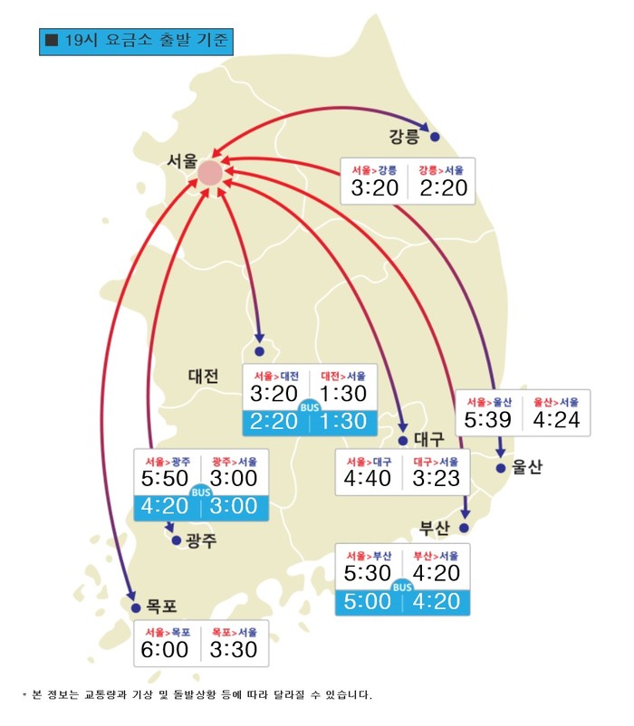이날 오후 7시 승용차를 통한 요금소 출발 기준, 서울에서 강릉까지 3시간 20분, 대전까지 3시간 20분, 대구까지 4시간 40분, 울산까지 5시간 39분 부산까지 5시간 30분, 광주까지 5시간 50분, 목포까지 6시간이 소요된다고 전해졌다.
