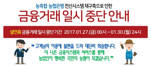 이번 설 연휴 기간 농협의 전산시스템 작업으로 인해 27일부터 30일까지 농협과 축협, NH농협은행 계좌를 이용한 모든 금융 거래가 일시 중단된다.
