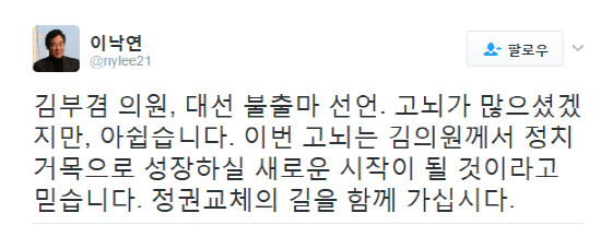 이낙연 도지사는 지난 7일 김부겸 의원이 국회에서 대선 불출마를 한 것에 대해 자신의 SNS를 통해 글귀를 남겼다.