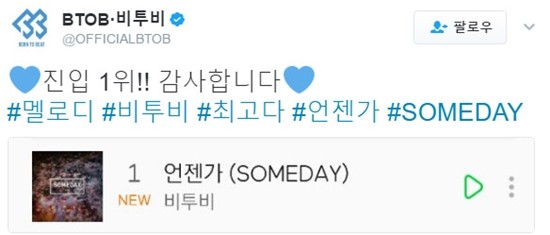 비투비는 공식 SNS를 통해 1위 진입 인증샷을 올리며 "진입 1위! 감사합니다"라고 팬들에게 감사한 마음을 드러냈다.
