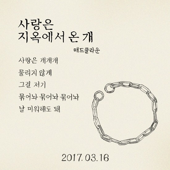 티저 이미지에는 "사랑은 지옥에서 온 개 사랑은 개개개 물리지 않게 그걸 저기 묶어놔 묶어놔 묶어놔 날 미워해도 돼"라는 글이 적혀있어 팬들의 기대감을 한껏 높였다.