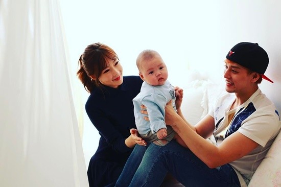 사진 속 일라이는 아들 김민수를 자신의 무릎 위에 앉히고 즐거운 듯 환하게 웃고 있다.