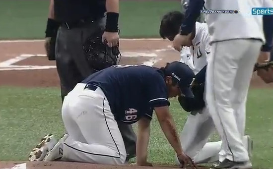 김명신 선수는 25일 경기에서 7번 타자 김민성의 타구에 얼굴을 가격 당했다.