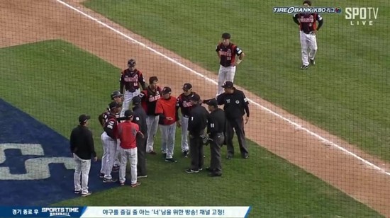 이 심판후 공수 교대 상황에서 이대호는 장비를 거칠게 벗어 던졌다는 이유로 퇴장을 받아 경기장을 찾은 야구 팬들을 당황케했다.
