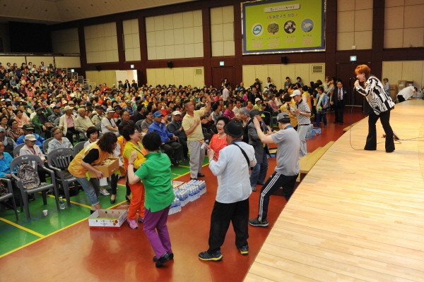 지난 23일 서울 동대문구청 다목적강당에서 서울재가장애인협회 주최, 행복한동대문구만들기모임 주관으로 ‘장애인-어르신 어울림 노래자랑’이 열렸다. 사진은 노래자랑 전에 진행된 축하공연에서 노래에 맞춰 즐겁게 춤추고 있는 노인들의 모습.(사진제공=동대문구청)
