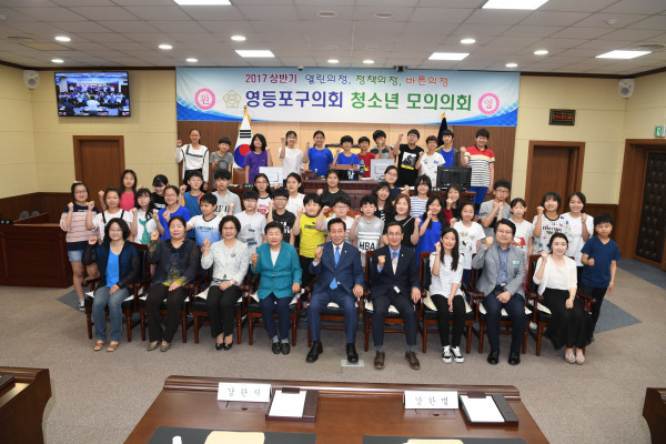 [시민일보=이진원 기자]최근 서울 영등포구의회(의장 이용주)는 구의회 본회의장에서 양일간의 일정으로 영림·문래초등학교, 영남·대영중학교 등 4곳 학교를 대상으로 ‘2017년 상반기 청소년 모의의회’를 개최했다. 사진은 이용주 의장 등 구의원과 학생들이 기념촬영을 하는 모습.(사진제공=영등포구의회)