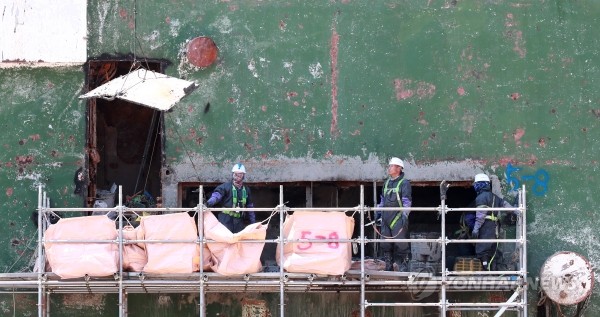 | ▲ 14일 전남 목포신항만 세월호 거치 장소에서 작업 관계자들이 선체 수색을 위한 지장물 제거 작업을 펼치고 있다.(사진제공=연합뉴스) | ||