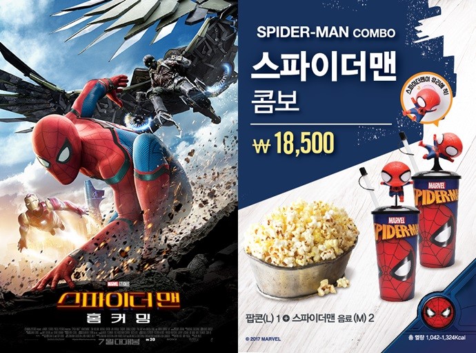 이번에 출시한 스파이더맨콤보는 라지 사이즈의 팝콘 1개와 스파이더맨 캐릭터 음료컵 2개로 구성돼 있다.