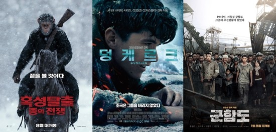 | ▲ (사진=영화 '혹성탈출: 종의전쟁', '덩케르크', '군함도' 포스터) | ||