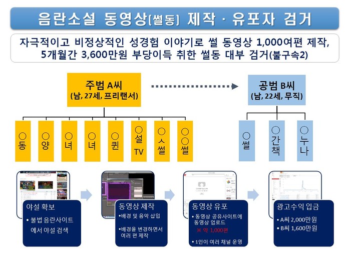 경찰에 따르면 이들은 불법 음란사이트에서 야한소설을 내려받은 뒤 이를 바탕으로 '썰동'을 제작, 이를 동영상 사이트에 게시한 혐의를 받고 있다. 경찰은 이들이 이같은 동영상을 올리고 광고수익으로 총 3600여만원의 부당이득을 취한 것으로 파악하고 있다.