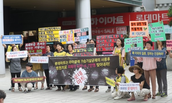 | ▲ 7일 오후 서울 중구 롯데마트 서울역점 앞에서 가습기살균제참사전국네트워크와 가습기살균제피해자와가족모임 주최로 '가습기살균제 참사'와 관련 롯데마트의 처벌을 촉구하는 기자회견이 열리고 있다.(사진제공=연합뉴스) | ||