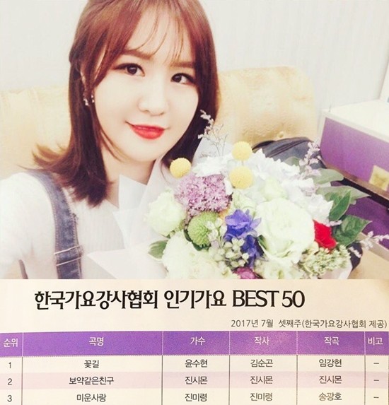 무서운 상승세로 인기를 몰며 트로트 부흥의 신호탄이 됐던 윤수현의 '꽃길'은 봄에 이어 7월 여름까지도 쟁쟁한 선배들의 곡들을 제치고 한국가요강사협회 인기가요 베스트 50에서 당당히 1위에 오르며 2017년 최고의 히트곡으로 입지를 굳혔다.
