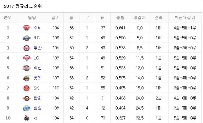 6위는 롯데, 7위는 SK, 8위는 한화, 9위는 삼성, 10위는 KT가 뒤를 이었다.