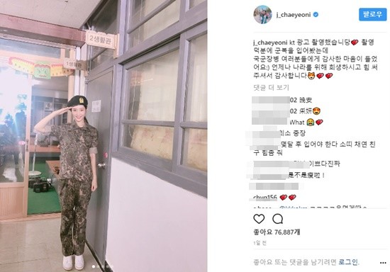 또한 정채연은 사진 옆에 "광고 촬영했습니당. 촬영 덕분에 군복을 입어봤는데 국군장병 여러분들에게 감사한 마음이 들었어요. 언제나 나라를 위해 희생하시고 힘 써주셔서 감사합니다"라는 글을 달아 국군장병들에게 고마움을 전하고 있다.