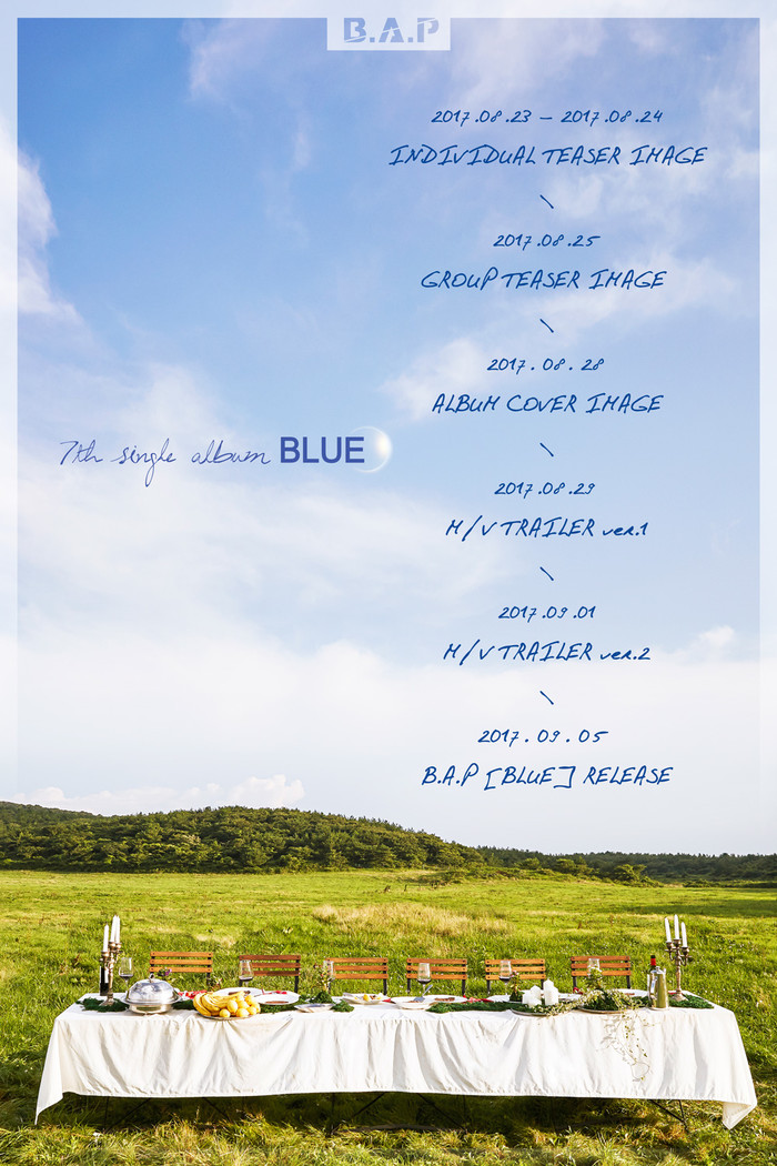오픈된 스케줄에 따르면 B.A.P는 8월 23일, 24일 두 차례에 걸쳐 멤버별 개인 티저 이미지를 공개하며 25일 단체 티저, 28일 앨범 커버 이미지, 29일과 9월 1일은 뮤직비디오 트레일러 영상을 두 가지 버전으로 나누어 공개한다. 마지막으로 9월 5일 일곱 번째 싱글앨범 '블루'의 음원과 뮤직비디오를 발표하며 B.A.P가 전격 컴백한다.