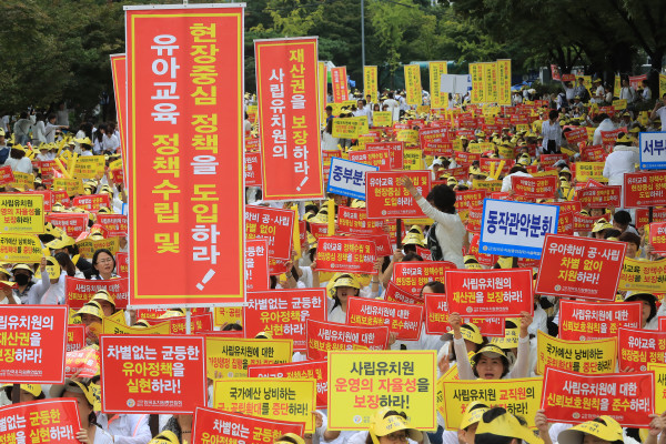 | ▲ 11일 오전 서울 영등포구 여의도동 산업은행 앞에서 한국유치원총연합회가 연 '유아교육 평등권 확보와 사립유치원 생존권을 위한 유아교육자 대회'에 참가한 시립유치원 원장들이 '유아학비 공·사립 차별없이 지원, 사립유치원 운영의 자율성 보장' 등을 촉구하는 구호를 외치고 있다.(사진제공=연합뉴스, | ||