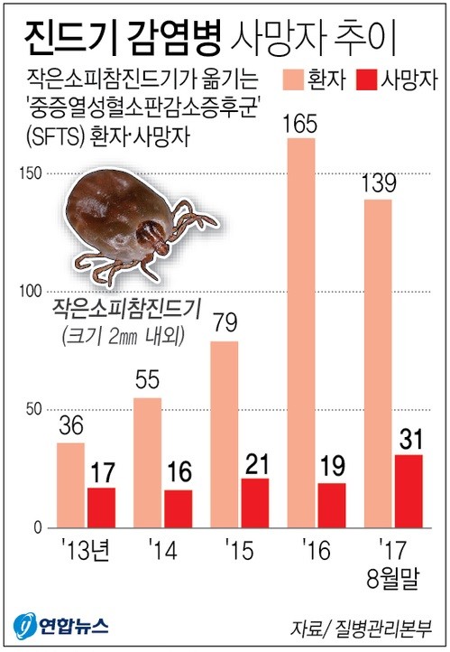 14일 질본에 따르면 작은소피참진드기가 옮기는 ‘중증열성혈소판감소증후군(SFTS)’의 환자 및 사망자가 8월 말 기준으로 전년대비 각각 121%, 244% 증가했다.