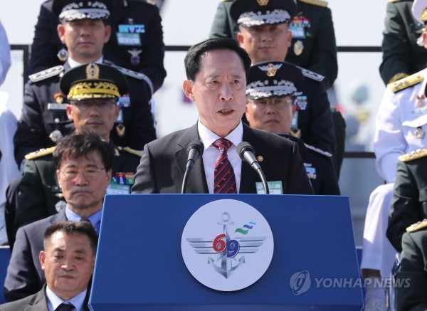 | ▲ 송영무 국방부장관이 28일 오전 경기 평택시 해군 2함대사령부에서 열린 건군 69주년 국군의 날 기념사를 하고 있다.(사진제공=연합뉴스) | ||