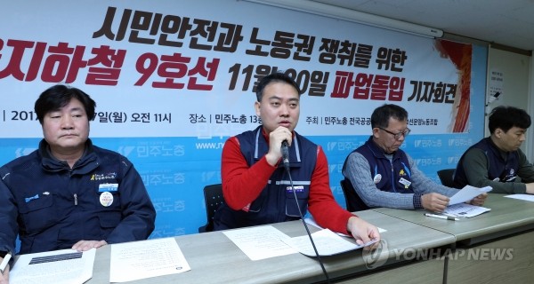 | ▲ 27일 오전 서울 중구 민주노총에서 박기범 서울9호선운영노조 위원장이 오는 30일 파업에 돌입할 것임을 밝히고 있다.(사진제공=연합뉴스) | ||