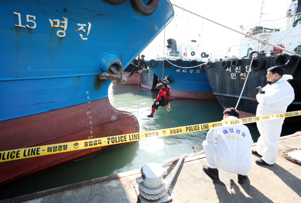 | ▲ 5일 오후 인천시 서구 북항 관공선부두에 정박한 급유선 명진15호에서 중부지방해양경찰청과 인천해양경찰서 관계자들이 현장감식을 하고 있다.(사진제공=연합뉴스) | ||