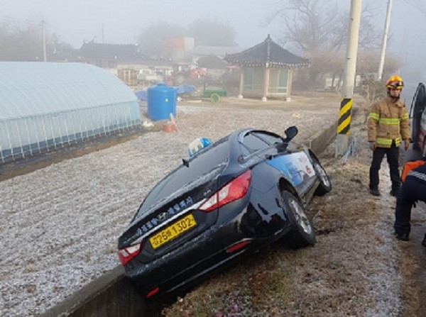 이 사고는 차량운행 중 도로에서 갑자기 차가 미끄러지면서 발생했다.