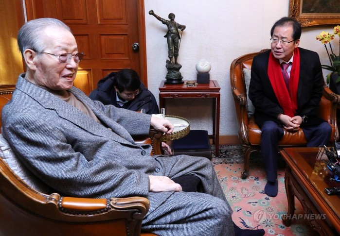 한편 홍 대표가 이날 김 전 총리에게 '수복강령'(壽福康寧) 글귀와 함께 난을 선물하자 김 전 총리는 "다리가 이쪽도 아프고 말하는 것도 기운이 없다"며 "그런데 여기는(홍준표 대표) 얼굴이 좋아졌네"라고 덕담을 건넸다.