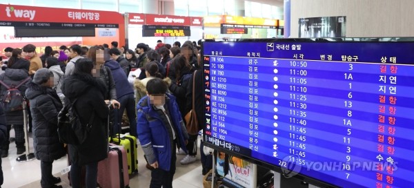 오전 11시 현재 ▲김포(11편) ▲광주(8편) ▲군산(2편) ▲김해(2편) ▲울산(1편) ▲대구(6편) ▲청주(6편) 등이 결항했으며, 제주공항은 오전 11시 이후 활주로가 정상화돼 운항을 재개했다.