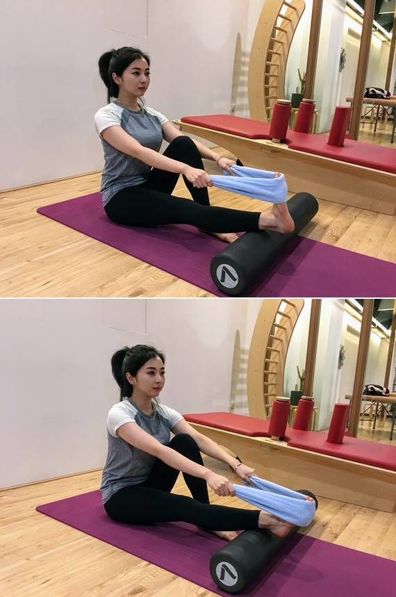 -> 쿠션 위에 종아리를 얹습니다. 무릎을 쭉 편 상태에서 수건을 발바닥 앞쪽에 걸치고 양손으로 수건을 잡습니다. 수건을 잡아당겨 발끝이 몸 쪽으로 향하도록 발을 젖힙니다. 이 때 종아리가 스트레칭되도록 합니다. 이 후 발등을 펴며 종아리 근육을 수축합니다. 이 두 동작을 30회 반복합니다. 단 스트레칭 시 3초가량 멈추어 줍니다.