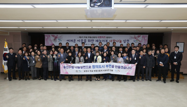 경기 부천시가 21일 개업공인중개사 100여명이 참석한 가운데 ‘제2기 무료 부동산중개 서포터즈 발대식’을 진행했다. 이로써 지역내 부동산중개사무소 1270곳은 어려운 이웃에게 무료로 중개서비스를 제공한다. 사진은 발대식에 참여한 공인중개사와 발대식 관계자들이 기념촬영을 하는 모습. (사진제공=부천시청)