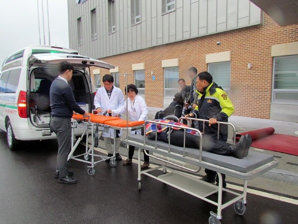 전남 장흥군은 최근 장흥통합의료한방병원에서 ‘제406차 민방위의 날 전국 화재대피 실제훈련’을 실시했다. 이날 대피훈련은 병원 관계자와 환자, 내원객 50여명이 참여한 가운데 실제 상황을 가정해 진행됐다. 사진은 환자를 앰뷸런스로 옮기는 훈련을 진행하는 모습.(사진제공=장흥군청)