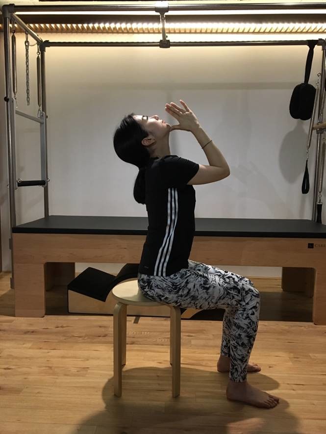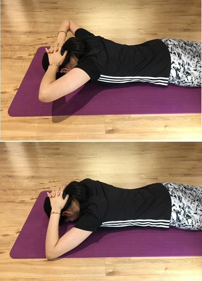 3) 양 팔꿈치를 최대한 들어올려 목과 어깨 근육이 수축되도록 한다. 수축 한 후 3초간 멈춘다.