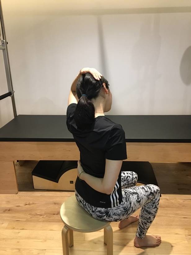 3) 반대 손으로 머리를 잡고 옆으로 깊게 눌러준다. 이 때 근육이 많이 당기는 느낌이 나도록 한다.