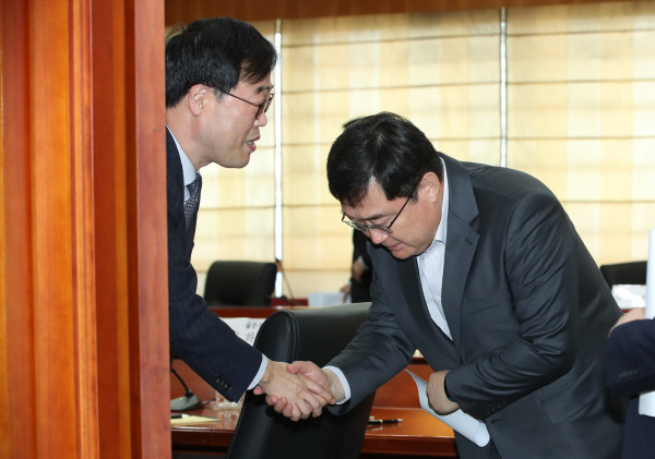 | ▲ 구성훈 삼성증권 대표이사가 10일 오전 서울 영등포구 한국금융투자협회에서 열린 '내부 통제 강화를 위한 증권사 대표이사 간담회'에를 마친 뒤 김기식 금융감독원장과 허리를 깊이 숙인 채 악수하고 있다.(사진제공=연합뉴스) | ||