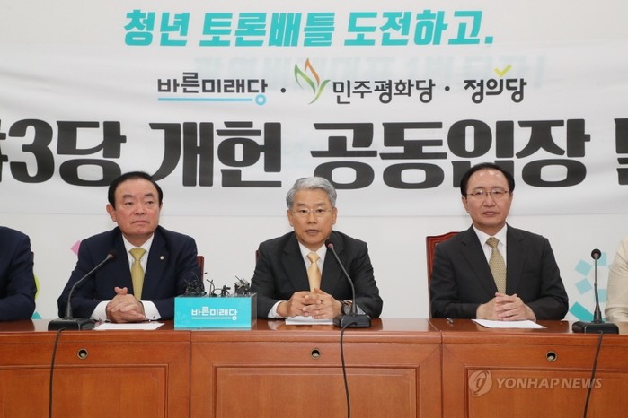 바른미래당 김동철 원내대표, 평화당 장병완 원내대표, 정의당 노회찬 원내대표와 각 당의 헌법개정·정치개혁특별위원회 간사 등 6명은 12일 거대양당인 민주당과 한국당에 조속한 개헌안 타협을 공개 촉구하는 공동 입장문을 발표했다.