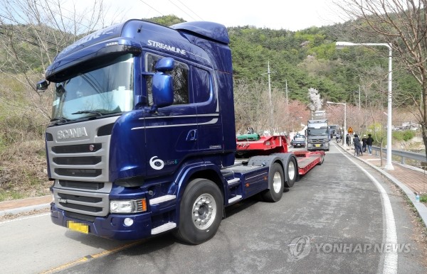 | ▲ 12일 오후 사드(THAAD·고고도 미사일 방어체계) 기지에 트레일러가 줄지어 들어가고 있다.(사진제공=연합뉴스) | ||