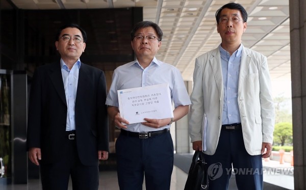 | ▲ 31일 오전 서초구 서울중앙지방검찰청에서 박순장 소비자주권시민회의 소비자감시팀장(가운데)이 라돈침대 사태와 관련해 강종민 원자력안전위원회 위원장을 관리 감독 부실에 따른 직무유기로 고발하기 위해 고발장을 들고 민원실로 향하고 있다.(사진제공=연합뉴스) | ||