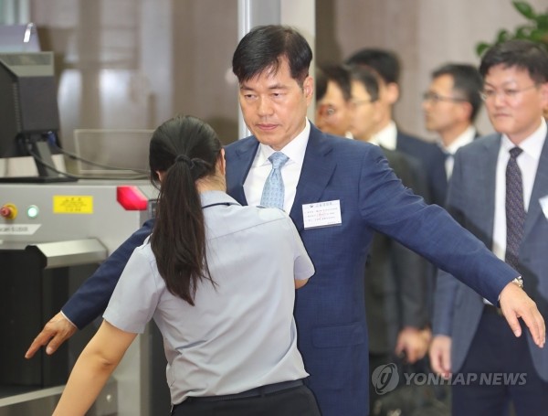 | ▲ 김태한 삼성바이오로직스 사장이 7일 서울 종로구 정부서울청사에서 열린 제1차 증권선물위원회에 참석하기 위해 청사를 방문, 금속탐지기로 몸수색을 받고 있다.(사진제공=연합뉴스) | ||