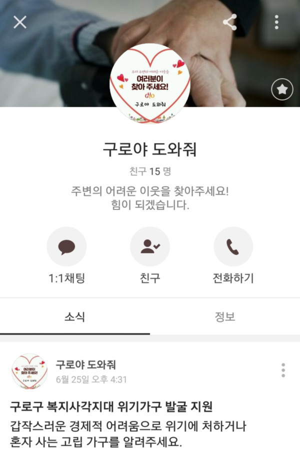 우선 누구나 이용 가능한 카카오톡 플러스 친구 ‘구로야 도와줘’를 개설해, 1대1 대화로 어려움에 놓인 가정, 위기가구로 의심되는 이웃을 부담없이 신고할 수 있도록 했다.