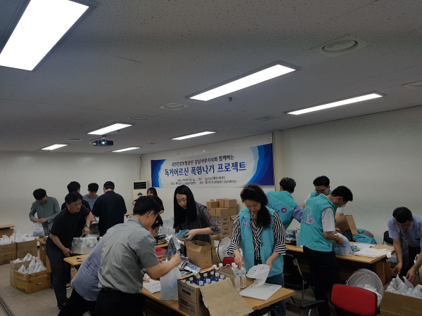 이번 프로젝트는 무더위쉼터운영 및 냉방용품 지원 등을 통하여 지역 내 어르신들의 혹서기 안전확보를 위해 실시되는 것으로, 자원봉사활동과 직원들에 의하여 제작된 응급폭염키트를 강남구 내 900여가구의 홀몸노인에게 담당 사회복지사들과 홀몸노인생활관리사들이 전달하는 방식으로 진행됐다.