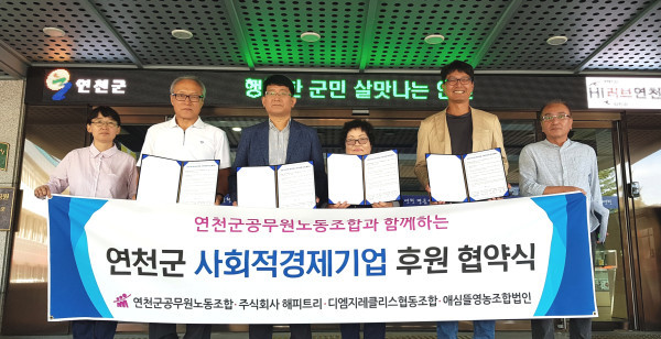 협약식에는 이성철 연천군공무원노조 위원장을 비롯한 김용택 주식회사 해피트리대표, 남궁금복 디엠지레클리스협동조합대표, 최철 애심뜰영농조합법인대표, 군 관계자 등이 참석했다.