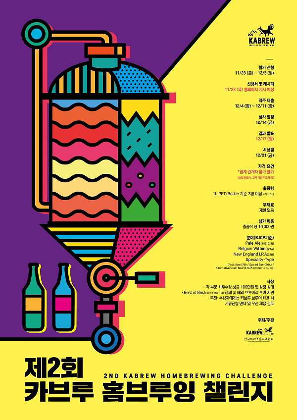출품 분야는 BJCP(Beer Judge Certification Program) 기준 ▲페일 에일(Pale Ale/18B, 24B) ▲윗비어(Belgian Witbier/24A) ▲IPA(New England IPA/21B) ▲스페셜티(Fruit Beer 29, Spiced Beer 30A, Alternative Grain Beer 31A) 총 4개 부문이다. 심사는 12월 14일 진행하며 12월 17일 결과를 발표할 예정이다.