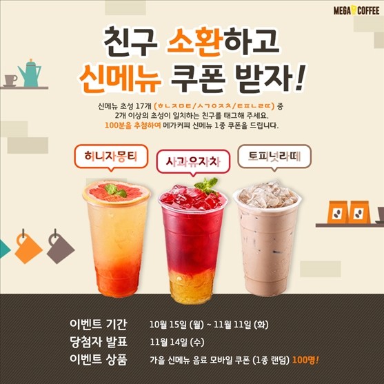 10월 15일부터 11월 11일까지 진행 중인 ‘페이스북 친구 소환’ 이벤트는 메가엠지씨커피 공식 페이스북 계정에서 확인할 수 있다.